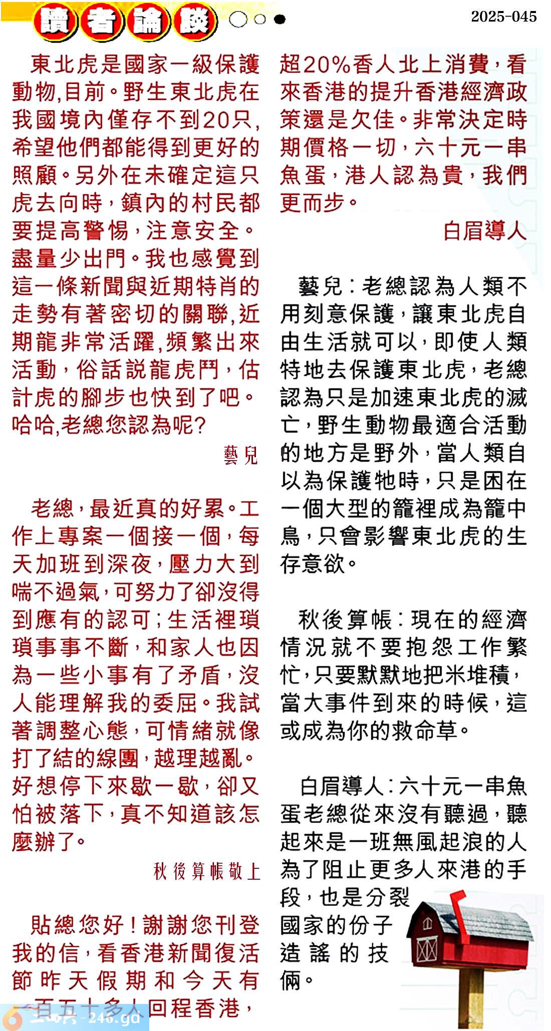 045期:彩民推荐〖貼信讀者論壇〗