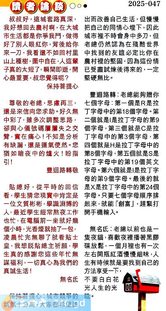 2.尊敬的老總,思慮再三,還是來信向您求助。好久無中彩了,雖多次調整思路卻與心儀號碼屢屢失之交臂,實在痛心!不知是分析有缺漏,還是運氣使然。您猶如暗夜中的爐火!盼指引!豐迴路轉敬