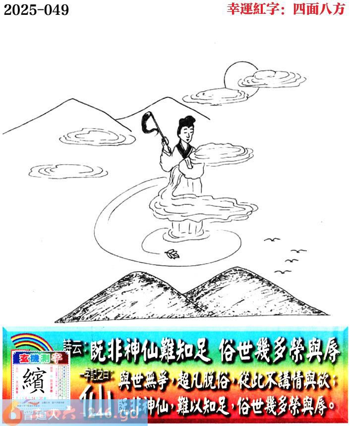049期老版跑狗一字記之曰:【仙】 詩雲:既非神仙難知足,俗世幾多榮與辱。
