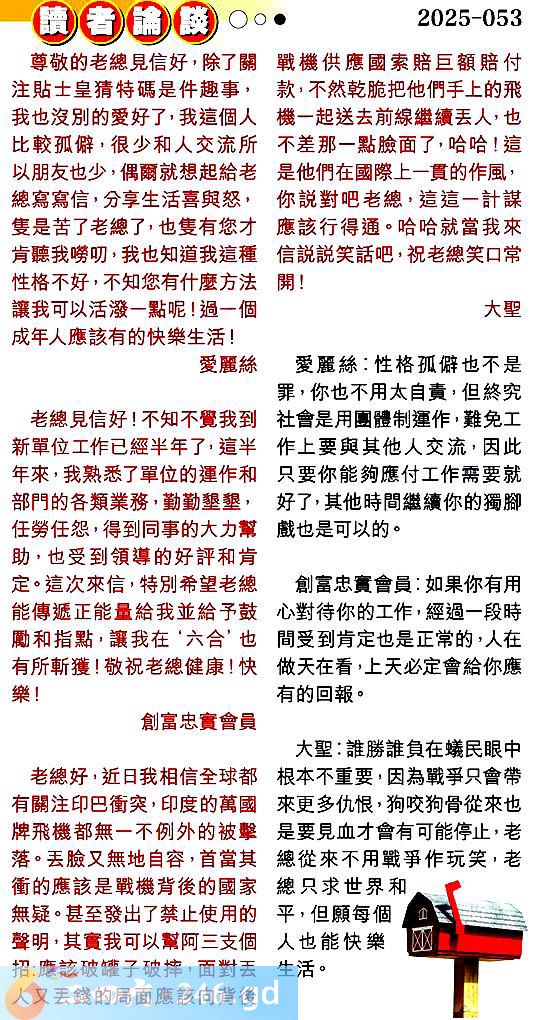 3.老總好,近日我相信全球都有關注印巴衝突,印度的萬國牌飛機都無一不例外的被擊落。丟臉又無地自容,首當其衝的應該是戰機背後的國家無疑。甚至發出了禁止使用的聲明,其實我可以幫阿三支個招:應該破罐子破摔,面對丟人又丟錢的局面應該向背後戰機供應國索賠巨額賠付款,不然乾脆把他們手上的飛機一起送去前線繼續丟人,也不差那一點臉面了,哈哈!這是他們在國際上一贯的作風,你說對吧老總,這這一計謀應該行得通。哈哈就當我來信說說笑話吧,祝老總笑口常開!大聖