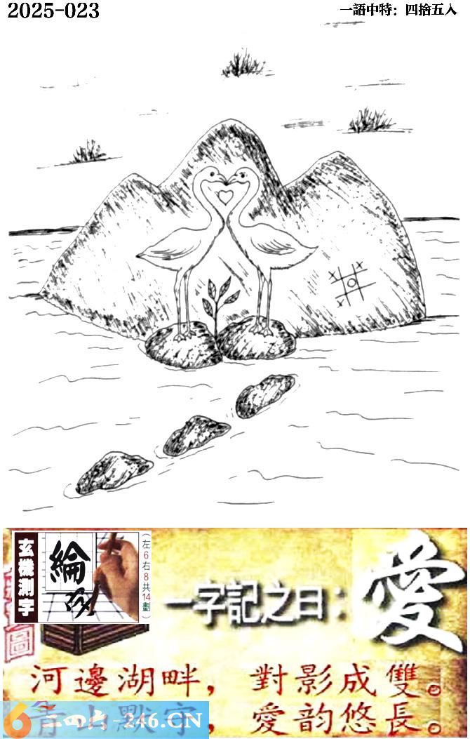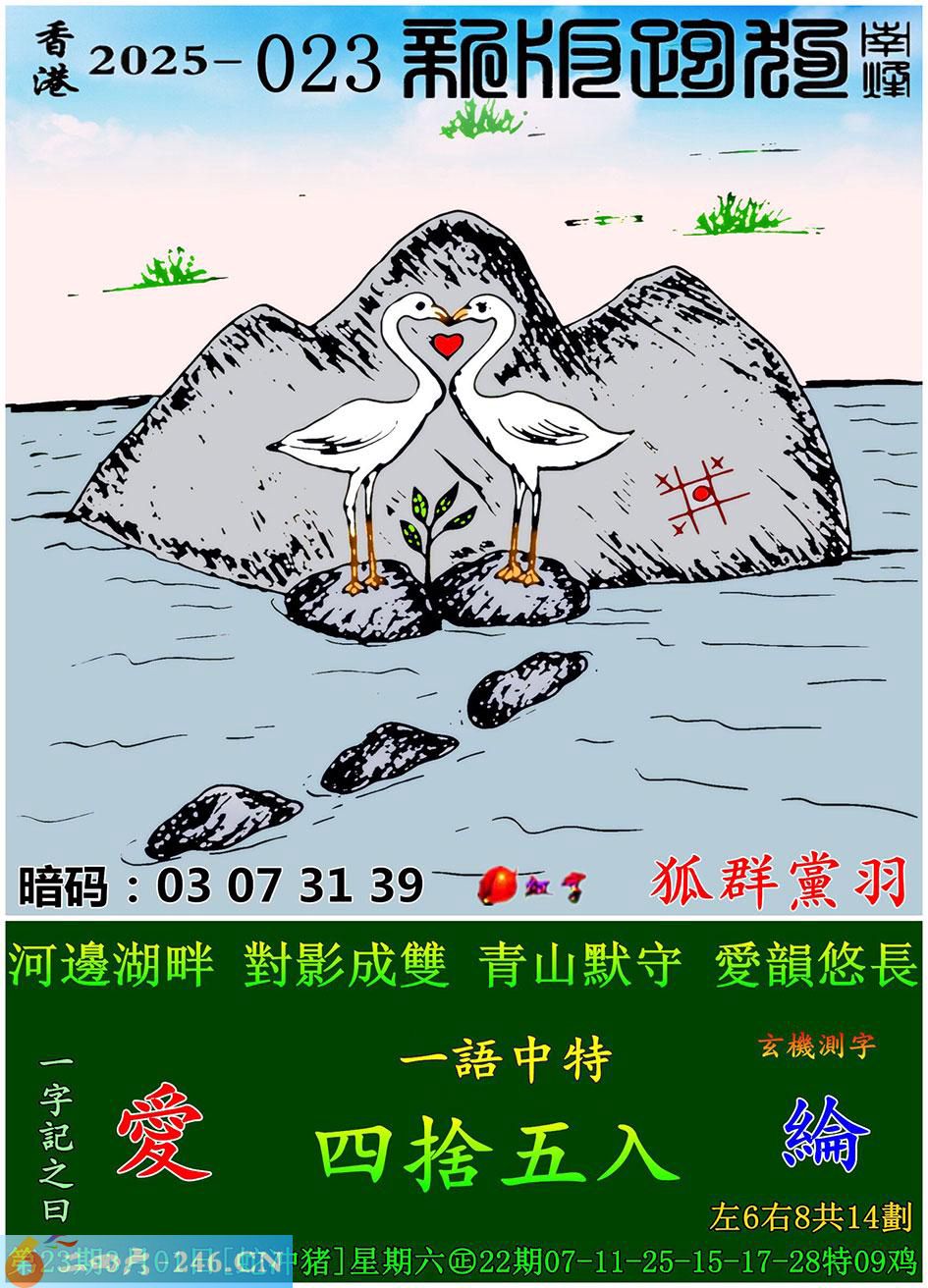023期跑狗一字記之曰:【愛】 河邊湖畔,對影成雙。 青山默守,愛韻悠長。