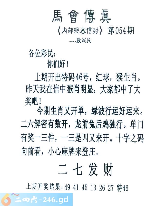 054期:首发推荐:≮馬會傳眞≯→(香港正版)