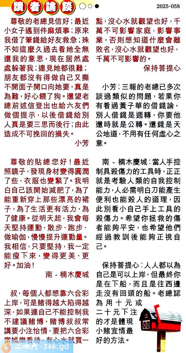 058期:彩民推荐〖貼信讀者論壇〗