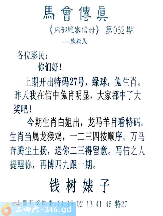 062期:首发推荐:≮馬會傳眞≯→(香港正版)