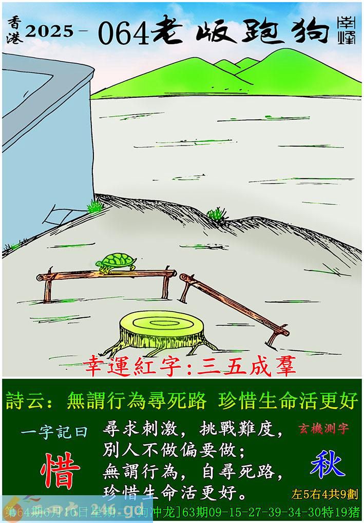 064期老版跑狗一字記之曰:【惜】 詩雲:無謂行為尋死路,珍惜生命活更好。