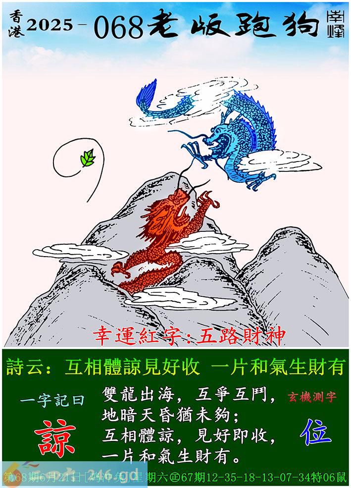 068期老版跑狗一字記之曰:【諒】 詩雲:互相體諒見好收,一片和氣生財有。