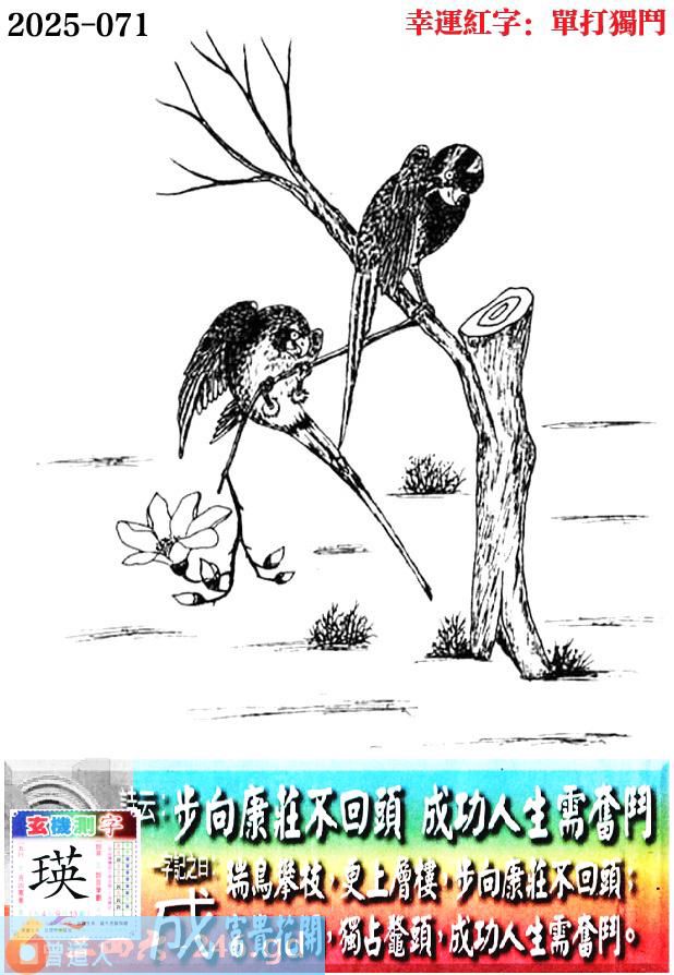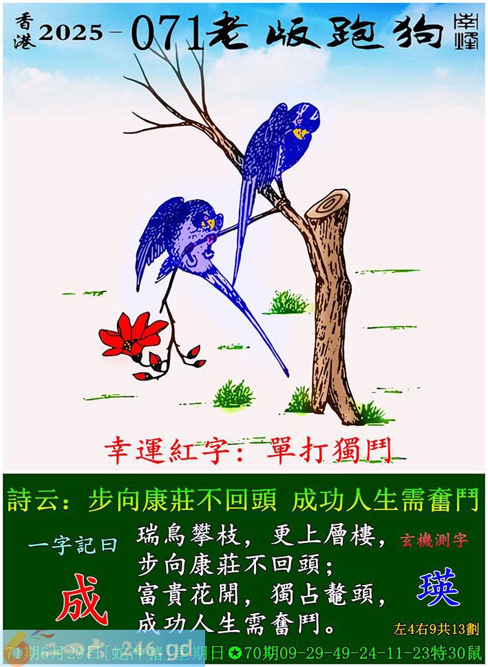 071期老版跑狗一字記之曰:【成】 詩雲:步向康莊不回頭,成功人生需奮鬥。