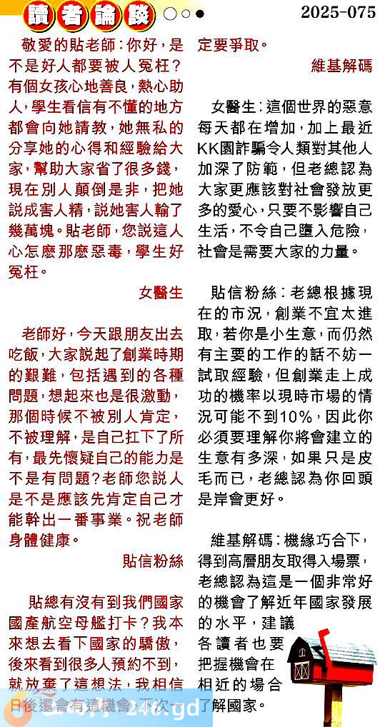 1.敬愛的貼老師:你好,不是好人都要被人冤枉?有個女孩心地善良,熱心助人,學生看信有不懂的地方都會向她請教,她無私的分享她的心得和經驗給大家,幫助大家省了很多錢,現在別人顛倒是非,把她說成害人精,說她害人輸了幾萬塊。貼老師,您說這人心怎麽那麼惡毒,學生好冤枉。女醫生