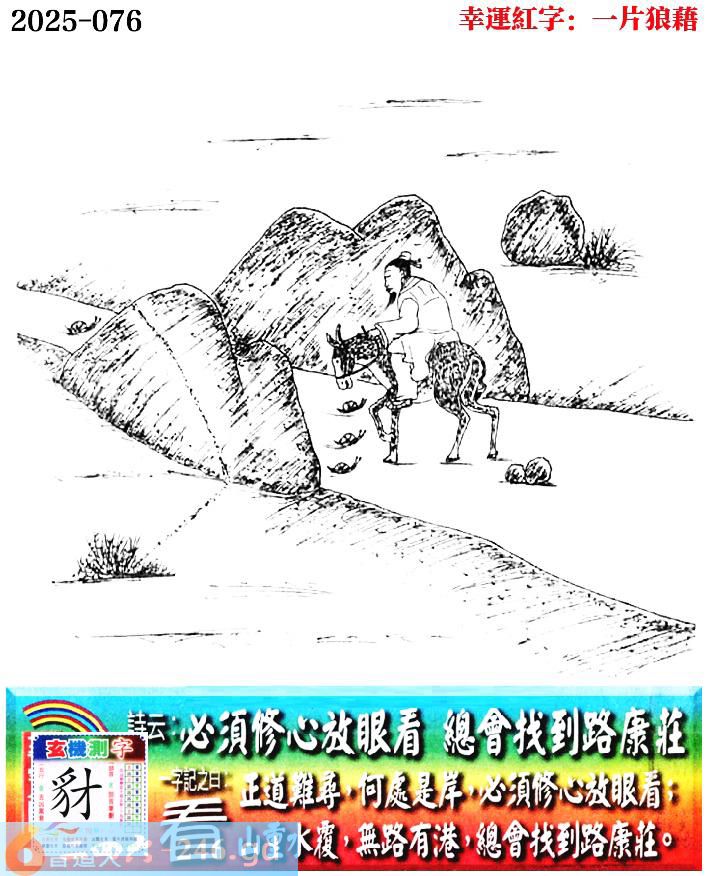 076期老版跑狗一字記之曰:【看】 詩雲:必須修心放眼看,總會找到路康莊。