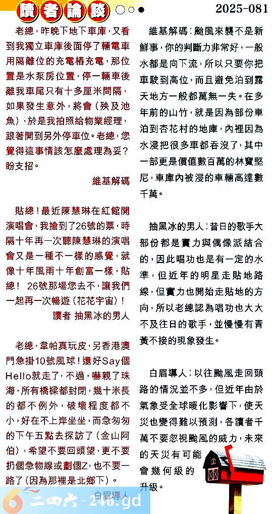 〖維基解碼〗:颱風來襲不是新鮮事,你的判断力非常好,一般水都是向下流,所以只要你把車駛到高位,而且避免泊到露天地方一般都萬無一失。在多年前的山竹,就是因為部份車泊到杏花村的地庫,內裡因為水浸把很多車都吞沒了,其中一部更是價值數二四六的林寶堅尼,車庫內被浸的車輛高達數千萬。