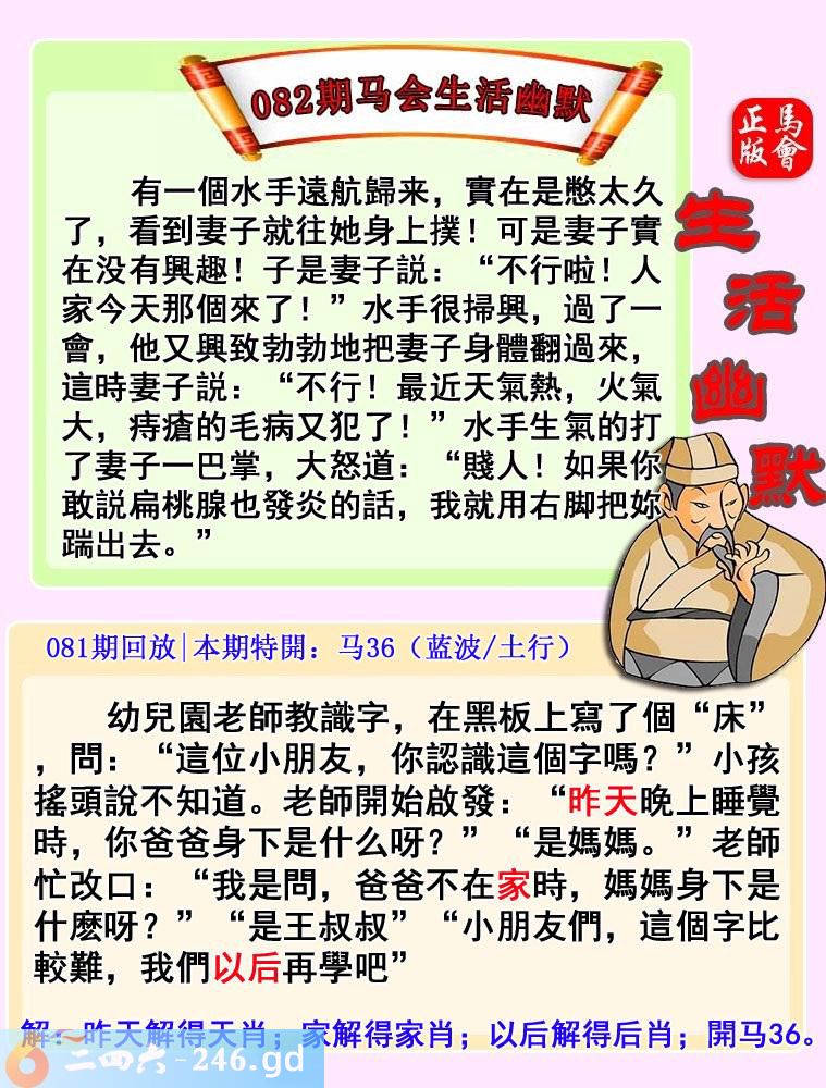 082期:首发推荐:≮馬會傳眞≯→(香港正版)马会生活幽默