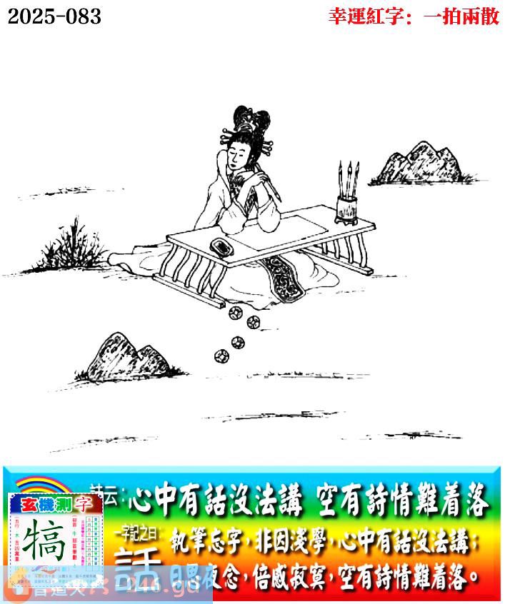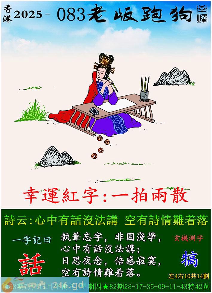 083期老版跑狗一字記之曰:【話】 詩云:心中有話沒法講,空有詩情難着落。
