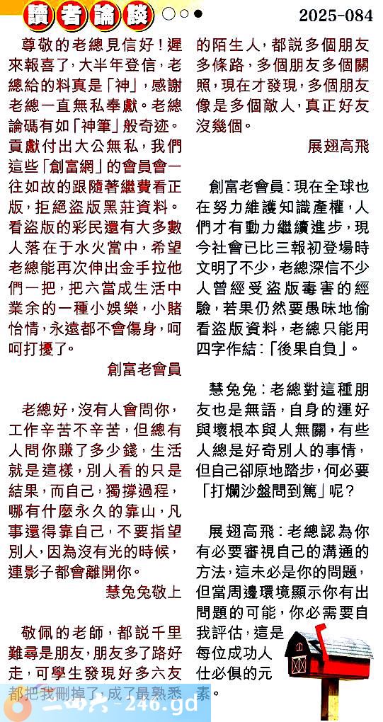 〖創富老會員〗:現在全球也在努力維護知識產權,人們才有動力繼續進步,現今社會已比三報初登場時文明了不少,老總深信不少人曾經受盜版毒害的經驗,若果仍然要愚昧地偷看盗版資料,老總只能用四字作結:「後果自負」。