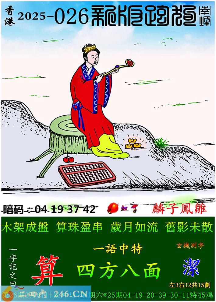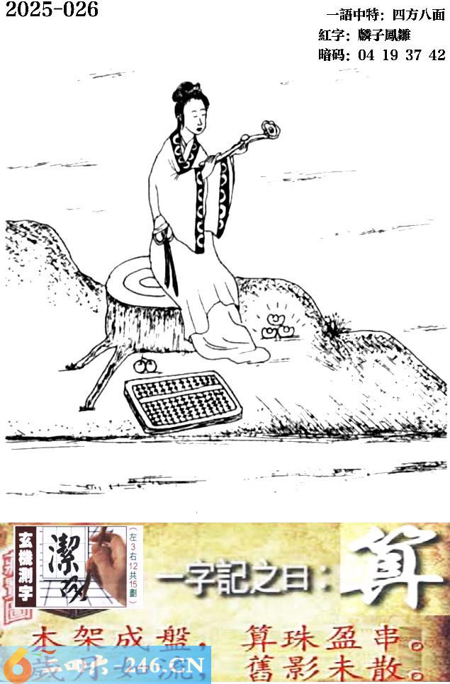 026期跑狗一字記之曰:【算】 木架成盤,算珠盈串。 歲月如流,舊影未散。