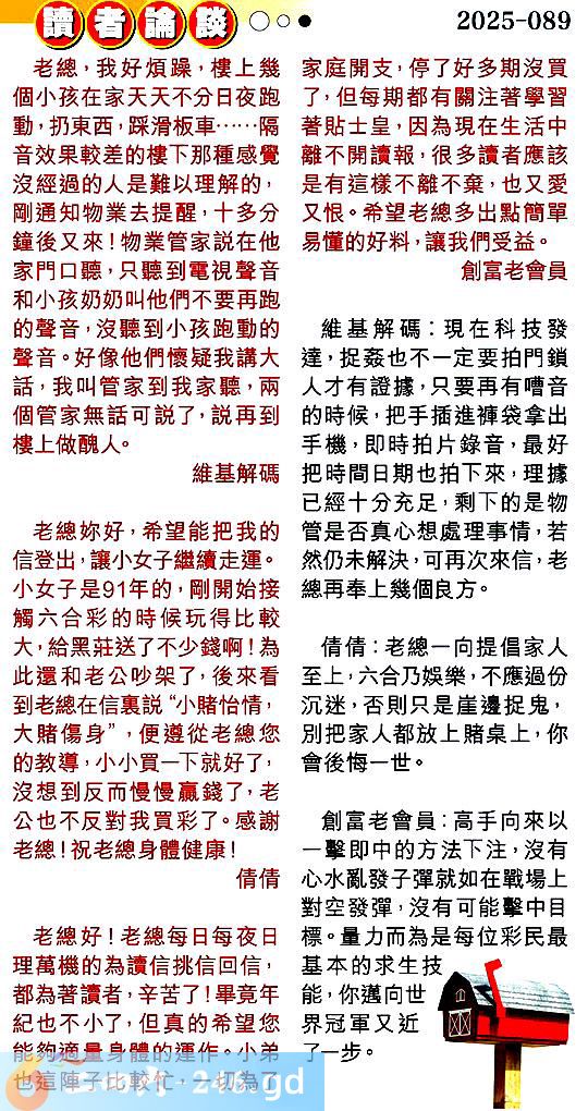 089期:彩民推荐〖貼信讀者論壇〗