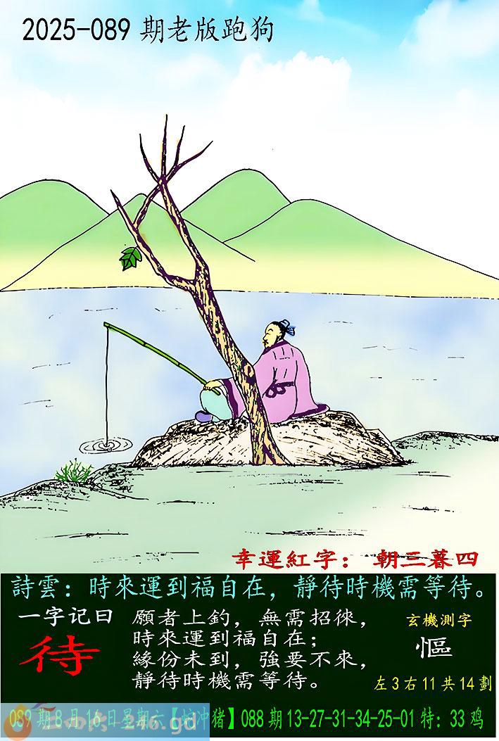 089期老版跑狗一字記之曰:【待】 詩雲:時來運到福自在,靜待時機需等待。