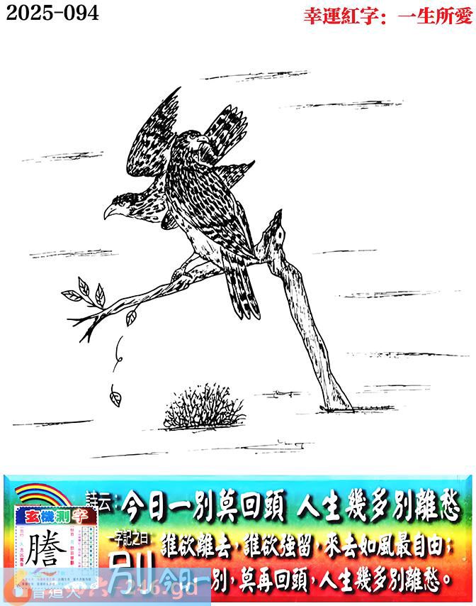 094期老版跑狗一字記之曰:【別】 詩雲:今日一別莫回頭,人生幾多別離愁。