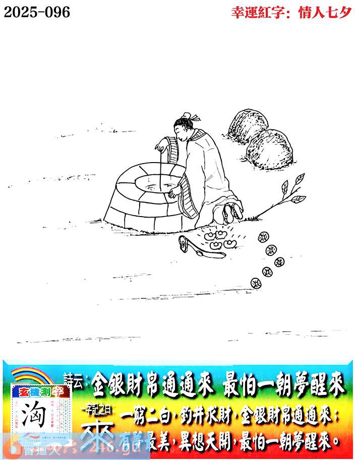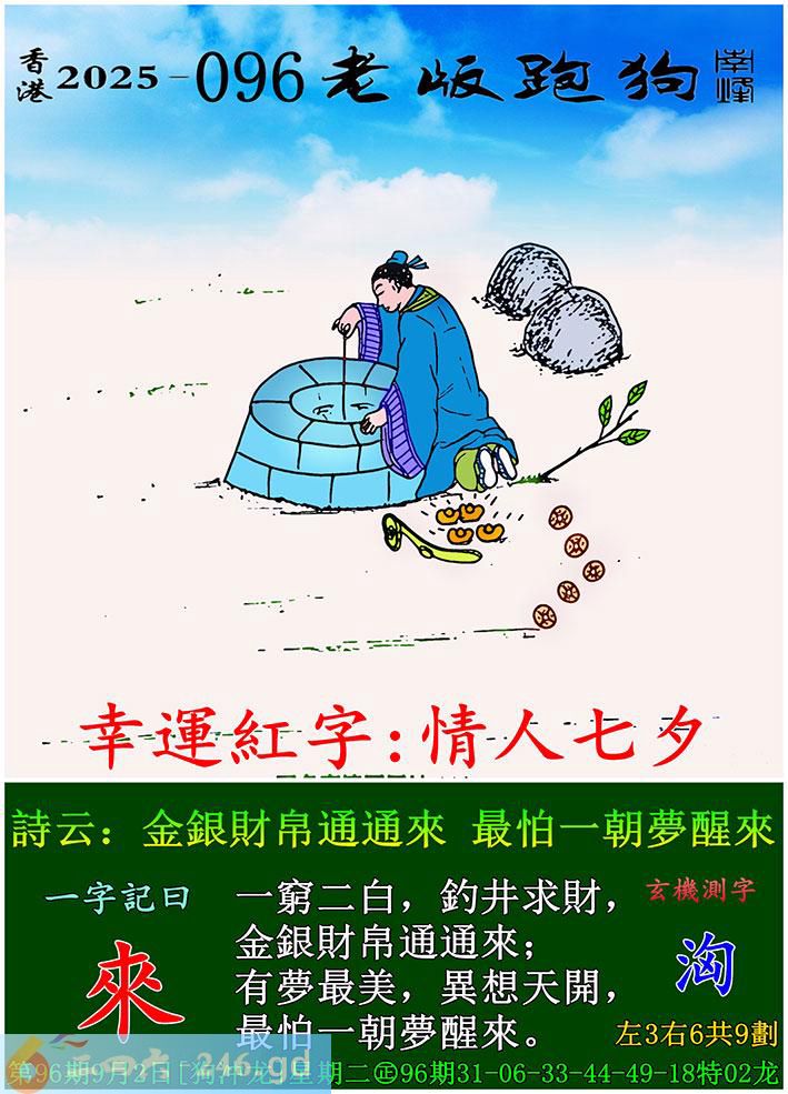 096期老版跑狗一字記之曰:【來】 詩雲:金銀財帛通通來,最怕一朝夢醒來。