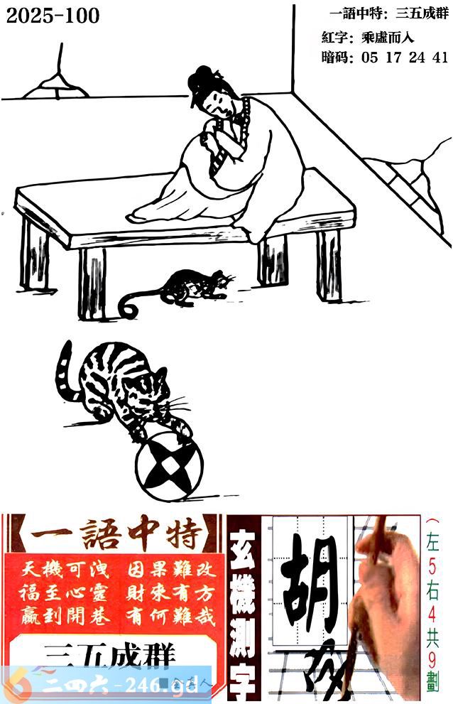 100期跑狗一字記之曰:【玩】 狸奴慵懒,不问鼠藏。 绒球在侧,爪拨戏玩。