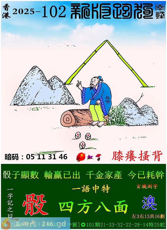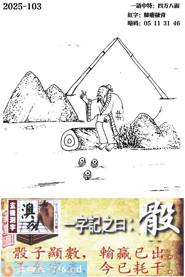 102期跑狗一字記之曰:【骰】 骰子顯數,輸贏已出。 千金家產,今已耗幹。