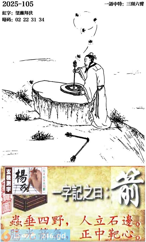 105期跑狗一字記之曰:【箭】 蟲垂四野,人立石邊。 騰光箭氣,正中靶心。