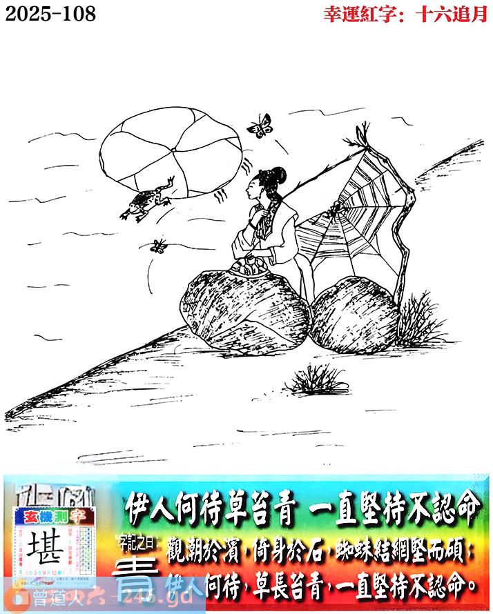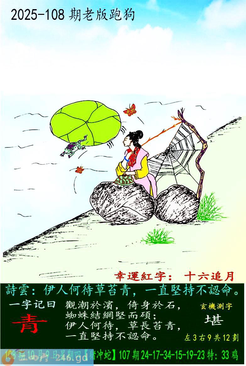 108期老版跑狗一字記之曰:【青】 詩雲:伊人何待草苔青,一直堅持不認命。