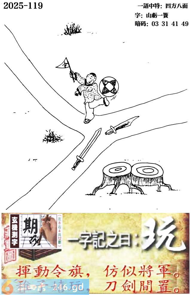 119期跑狗一字記之曰:【玩】 揮動令旗,仿似將軍。 稚子嬉玩,刀劍間置。