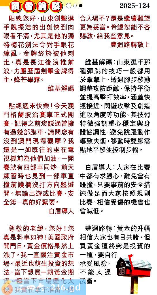 2.貼總週末快樂!今天澳門格蘭披治赛車正式開賽,記得之前您說過曾擁有過幾部跑車,請問您有沒到澳門現場觀摩?我還是一如既往的坐在電視機前為他們加油,一開賽就有四部車同炒,前天練習時也見到一部車直撞前護欄沒打方向盤避開。無論出遊或比賽,安全第一真的好緊要。白眉導人