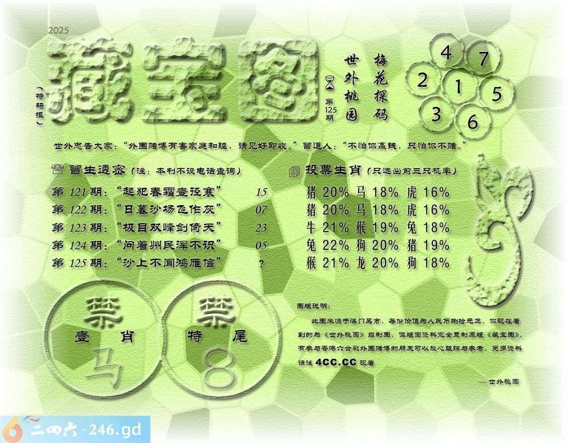 125期藏寶圖 新:合向杨妃冢上生 老:沙上不闻鸿雁信 禁:马 禁:8尾 玄機字:《溷》