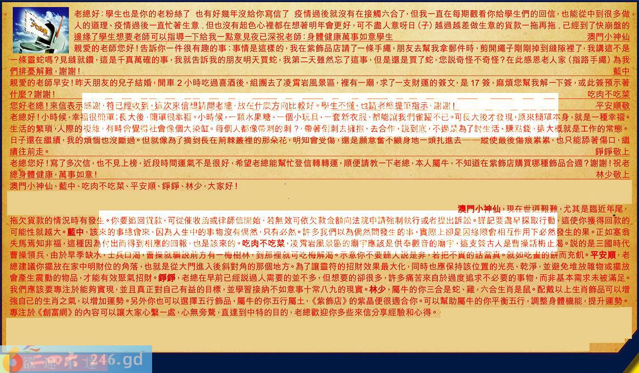 【1】.老總好:學生也是你的老粉絲了也有好幾年沒給你寫信了疫情過後就沒有在接觸六合了,但我一直在每期觀看你給學生們的回信,也能從中到很多做人的道理、疫情過後一直忙著生意.但也沒有起色心裡都在想著明年會更好,可不盡人意呀日(子)越過越差做生意的貨款一拖再拖.已經到了快崩盤的邊緣了學生想要老師可以指導一下給我一點意見夜已深祝老師:身體健康萬事如意學生澳門小神仙