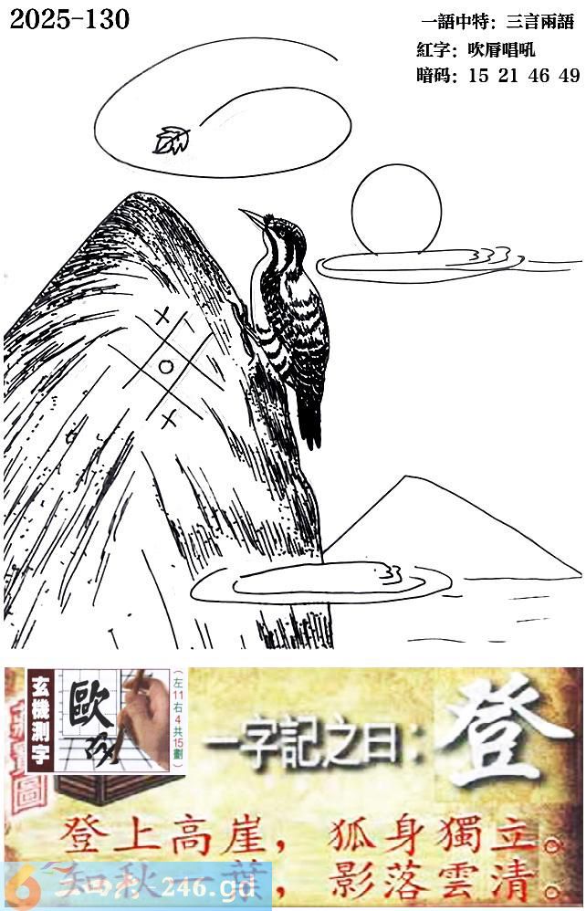 130期跑狗一字記之曰:【登】 登上高崖,狐身獨立。 知秋壹葉,影落雲清。