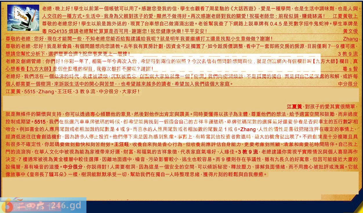 【5】.老總及創網管總:你們好!停彩一年了,相隔一年今再次入會,希望得到兩位的關照?今次去信有個問題想問兩位,就是創富網內有個欄目叫【九方大師】欄目,真心想看看【九方大師】是個什麼樣的欄目我每次都打不開呢?謝謝!粤智