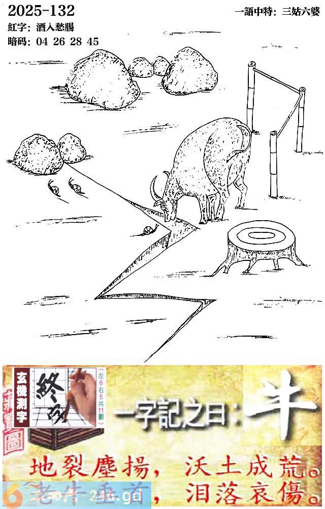 132期跑狗一字記之曰:【牛】 地裂塵揚,沃土成荒。 老牛垂首,淚落哀傷