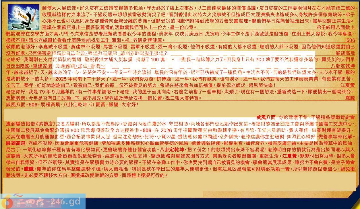 【4】.老總好,我剛剛在支付寶捐款的管道,馳援香港大埔火災救援,捐獻了100塊。。盡我一點綿薄之力了。因我身上只有700塊了要不然我還想多娟的。願受災的人們早日走出陰影,重建家園,渡過難關加油,香港八卦定乾坤