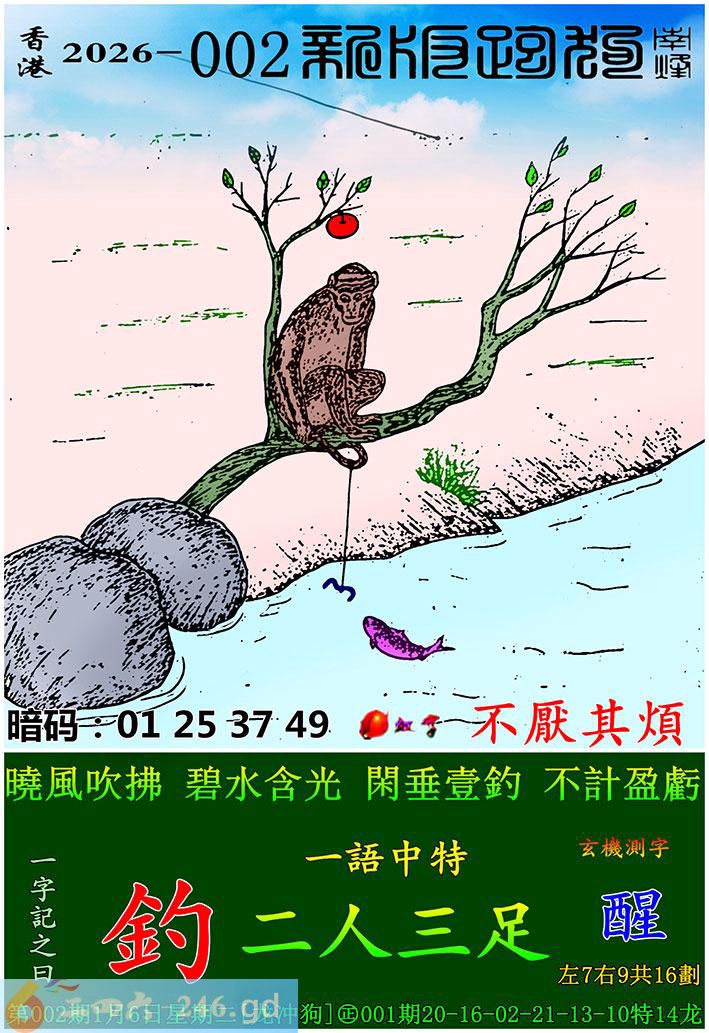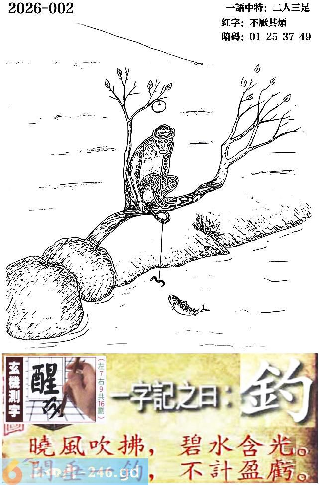 002期跑狗一字記之曰:【釣】 曉風吹拂,碧水含光。 閑垂壹釣,不計盈虧。