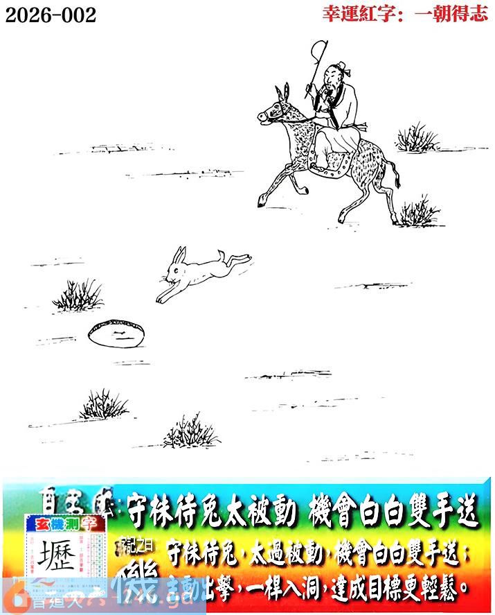 002期老版跑狗一字記之曰:【機】 詩雲:守株待兔太被動,機會白白雙手送。