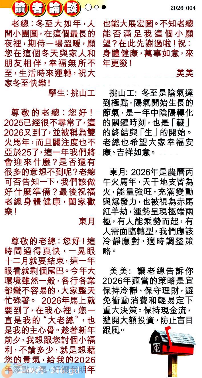 2.尊敬的老總:您好!2025已經很不尋常了,這2026又到了,並被稱為雙火馬年,而且關注度也不亞於25了,這一年我們將會迎來什麼?是否還有很多的意想不到呢?老總可否告知一下,我們該做好什麼準備?最後祝福老總身體健康,閏家歡樂!東月