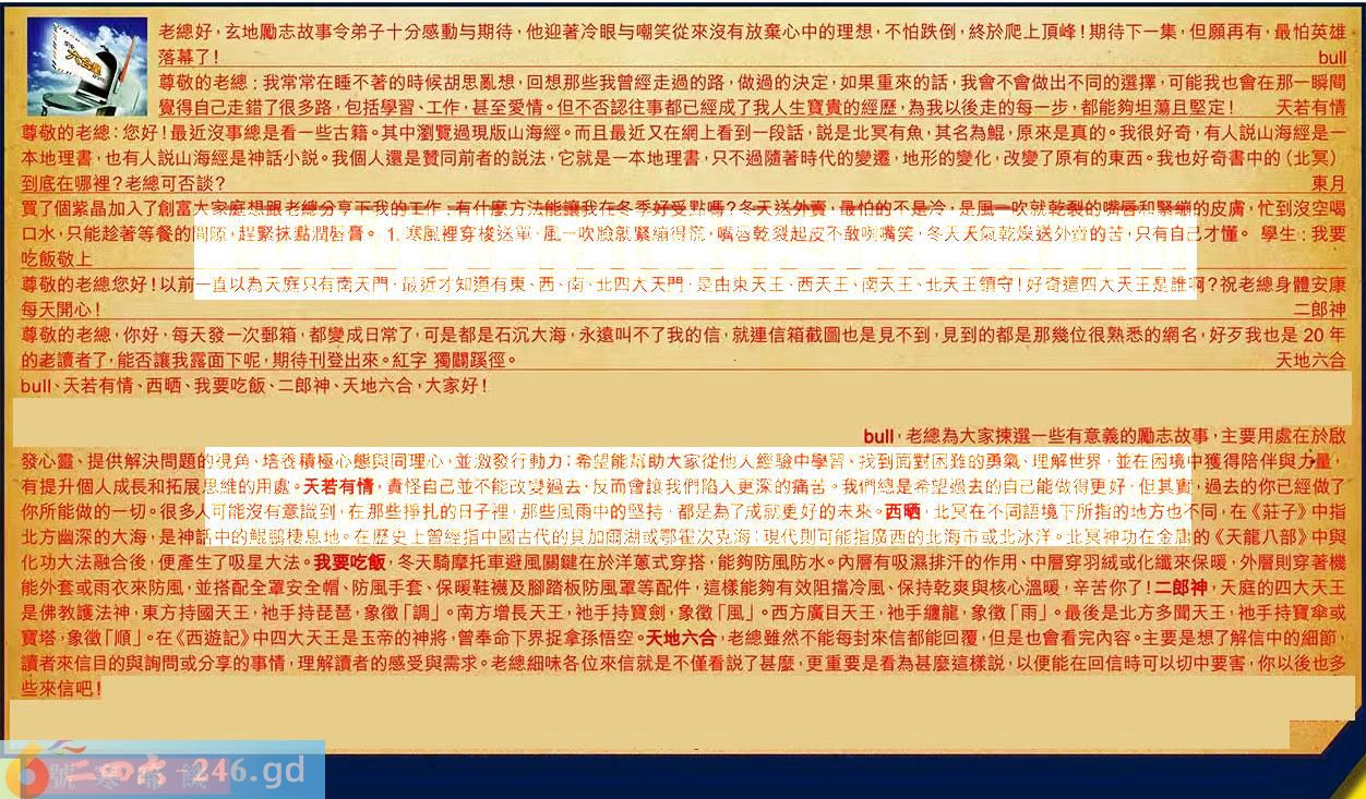 【6】.尊敬的老總,你好,每天發一次郵箱,都變成日常了,可是都是石沉大海,永遠叫不了我的信,就連信箱截圖也是見不到,見到的都是那幾位很熟悉的網名,好歹我也是20年的老讀者了,能否讓我露面下呢,期待刊登出來。紅字獨關蹊徑。天地六合