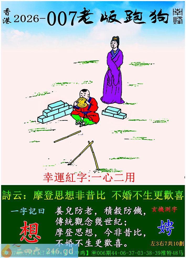 007期老版跑狗一字記之曰:【想】 詩雲:摩登思想非昔比,不婚不生更歡喜。