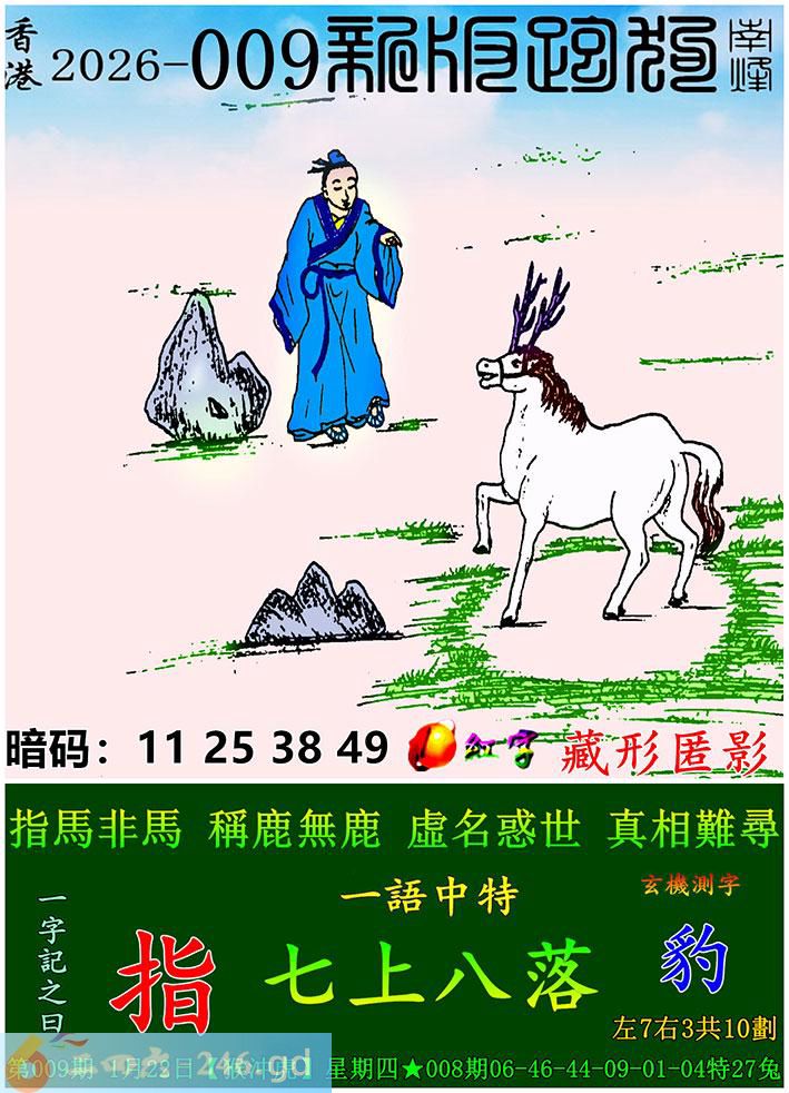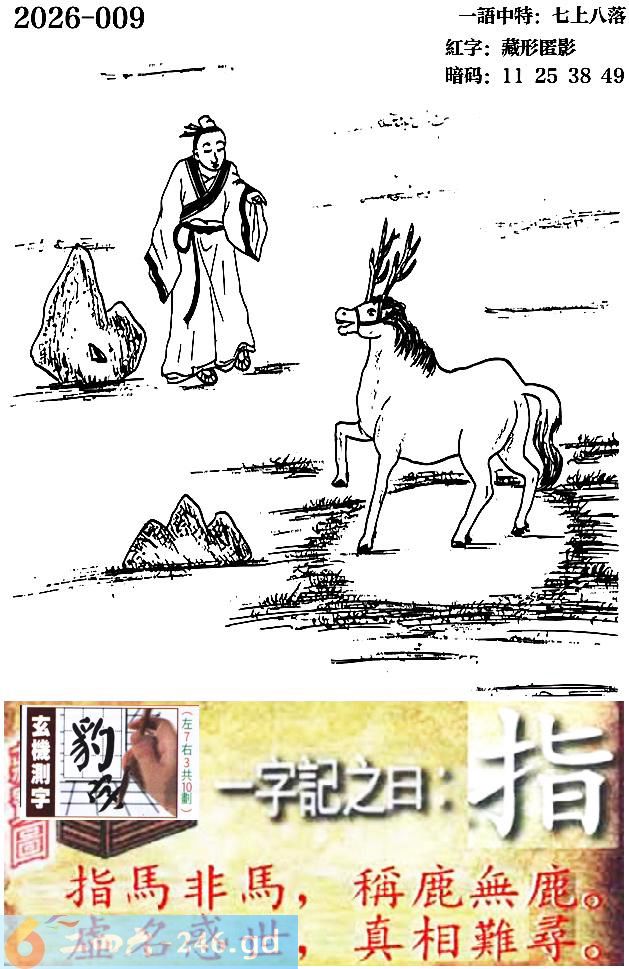 009期跑狗一字記之曰:【指】 指馬非馬,稱鹿無鹿。 虛名惑世,真相難尋。