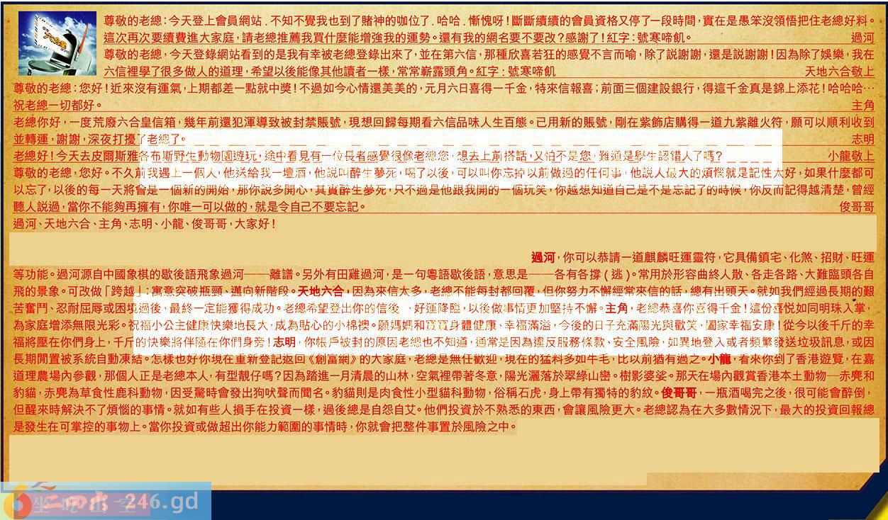 【2】.尊敬的老總,今天登錄網站看到的是我有幸被老總登錄出來了,並在第六信,那種欣喜若狂的感覺不言而喻,除了説謝謝,還是説謝謝!因為除了娱樂,我在六信裡學了很多做人的道理,希望以後能像其他讀者一樣,常常嶄露頭角。紅字:號寒啼飢天地六合敬上