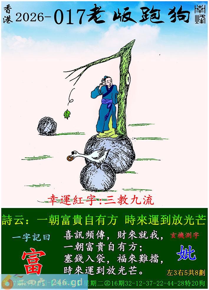 017期老版跑狗一字記之曰:【富】 詩雲:一朝富貴自有方,時來運到放光芒。