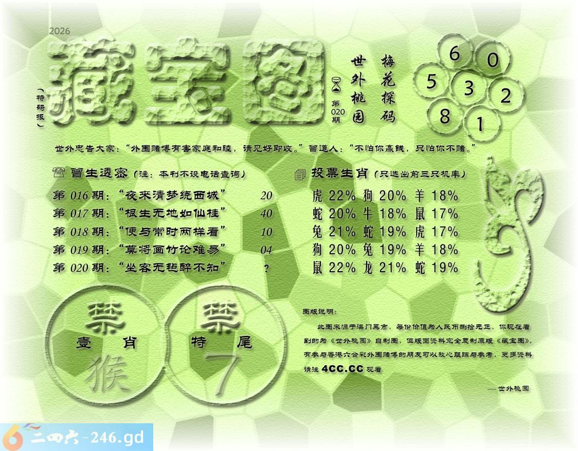 020期藏寶圖 新:可能同读远游无 老:坐客无毡醉不知 禁:猴 禁:7尾 玄機字:《套》