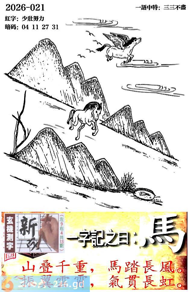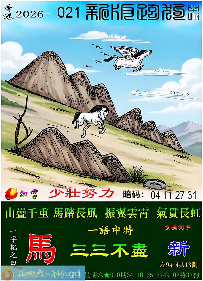 021期跑狗一字記之曰:【馬】 山疊千重,馬踏長風。 振翼雲霄,氣貫長虹。