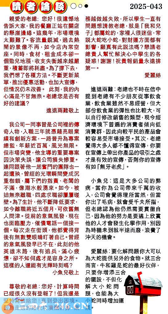 1.親愛的老總:您好!很遗憾地告訴大家,我的餐廳正站在關店的懸崖邊緣。這幾年市場環境太艱難了。客流量锐減,過去熱鬧的景像不再,如今店内常空座。同時,食材,租金成本卻一個勁兒地漲,收支失衡越來越嚴重,積蓄即將耗盡。為了撐下去,我們想了各種方法。不斷更新菜單,推出優惠活動,也加大宣傳,但情況仍未改善。此刻,我的內心滿是不甘無奈。老總您是否有好的建議?進退兩難敬上