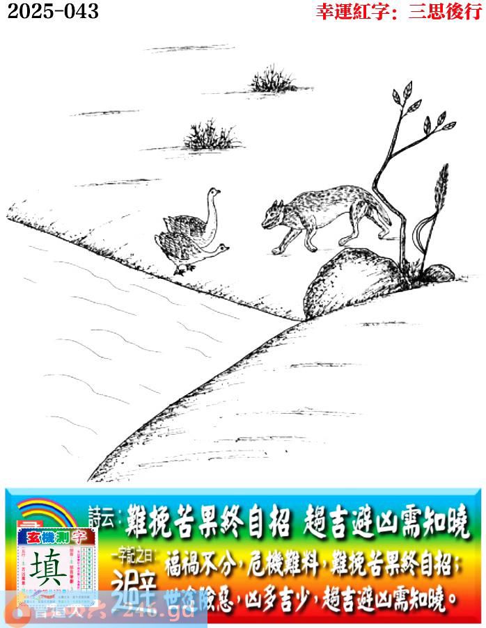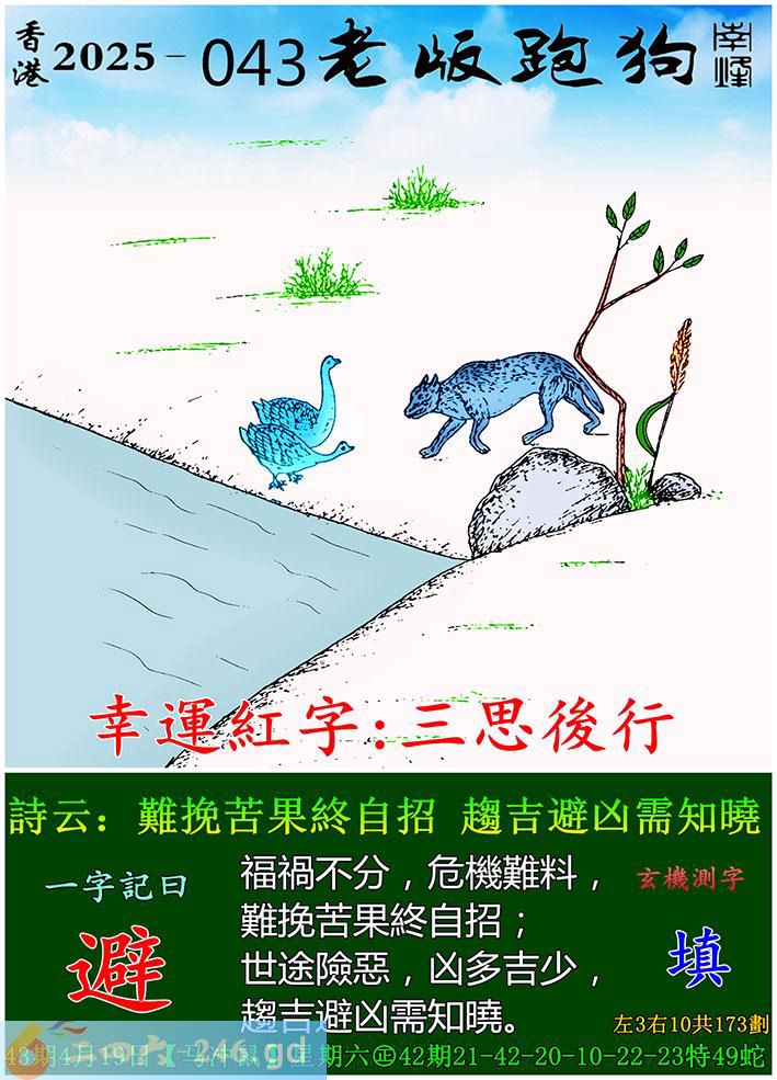 043期老版跑狗一字記之曰:【避】 詩雲:難挽苦果終自招,趨吉避凶需知曉。
