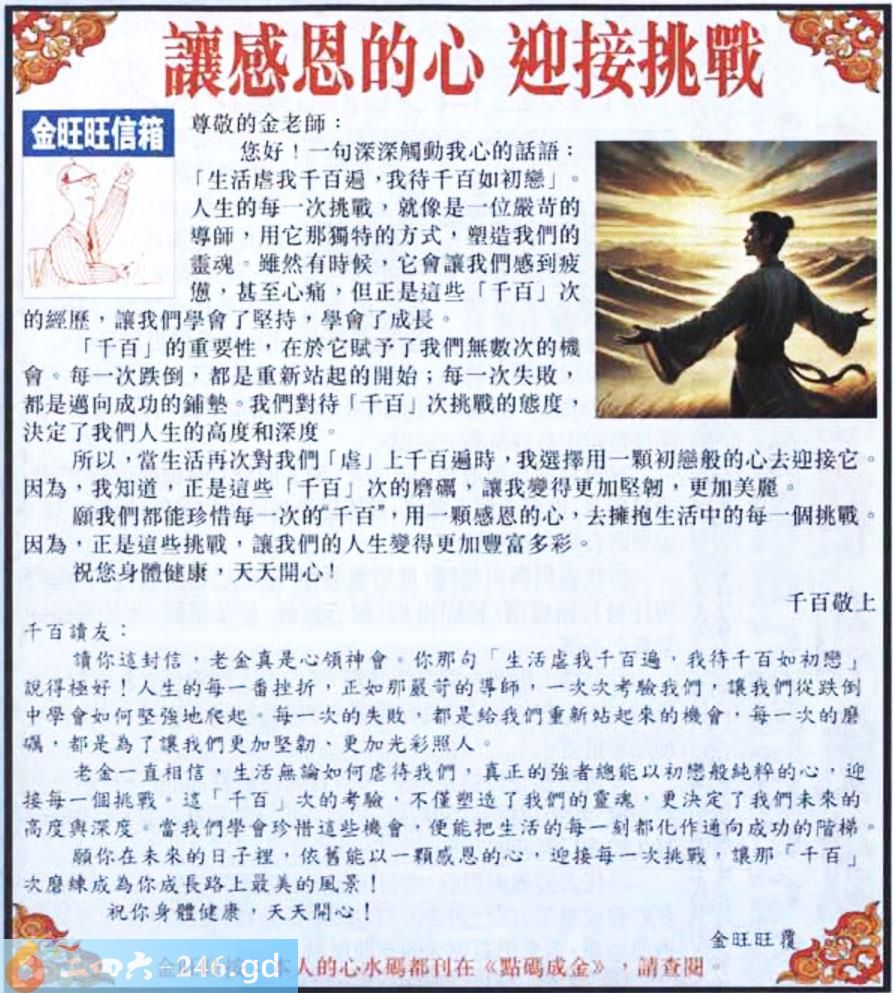 047期:金旺旺信箱彩民推荐→→《讓感恩的心 迎接挑戰》
