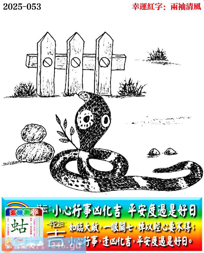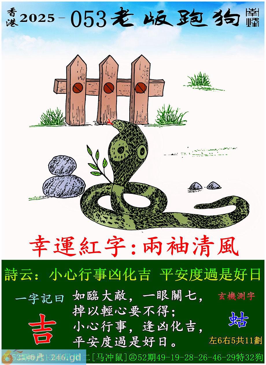053期老版跑狗一字記之曰:【吉】 詩雲:小心行事凶化吉,平安度過是好日。
