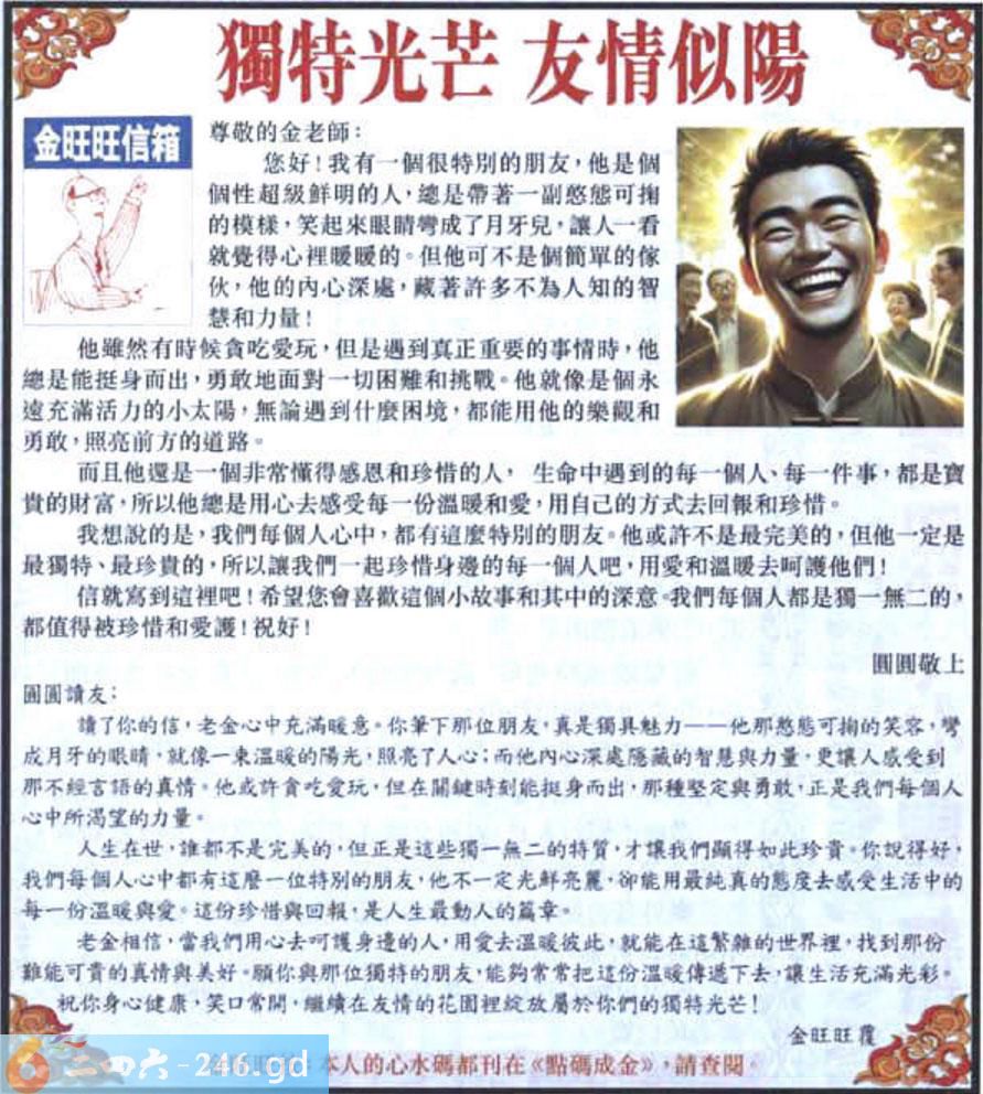 055期:金旺旺信箱彩民推荐→→《獨特光芒 友情似陽》