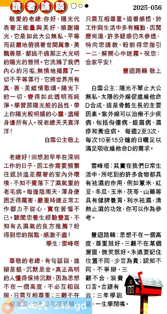 3.尊敬的老總,有句話说,雄辯是銀,沉默是金。真正高明的人懂得保持沉默,因為思想不在一個高度,不必互相說服,只需互相尊重;三觀不在一個層面,也不必互相理解,只需互相尊重。這番感悟,於工作與生活中多有觸動,因閱歷尚淺,許多疑惑仍未参透,特向您請教,盼能得您指引一二,解開心中迷霧。祝您:合家平安!豐迴路轉敬上